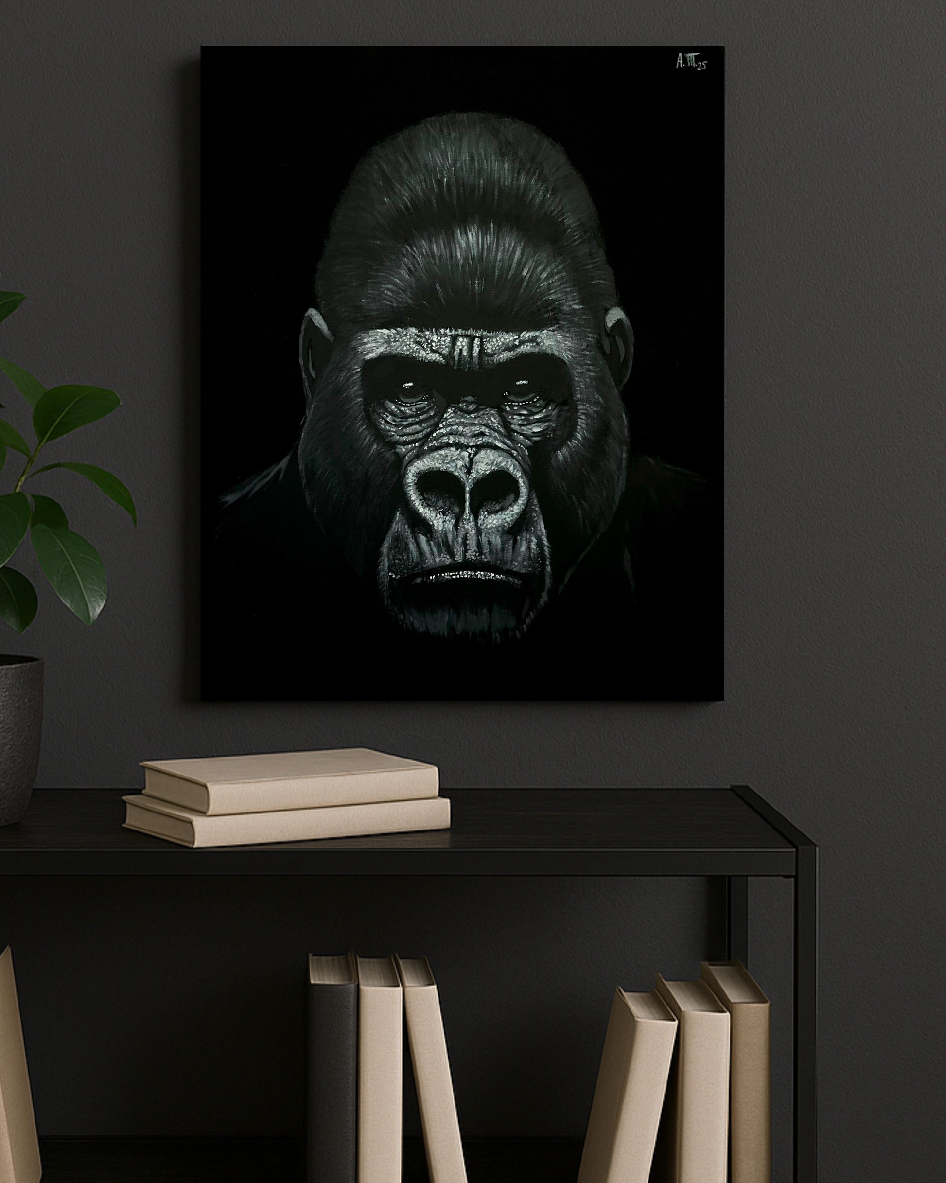 Part of the Wild Monochrome series, this artwork is designed to stand out with bold detailing and dramatic lighting. The gorilla’s gaze emerges from the dark, inviting reflection and adding a profound sense of depth to any space.