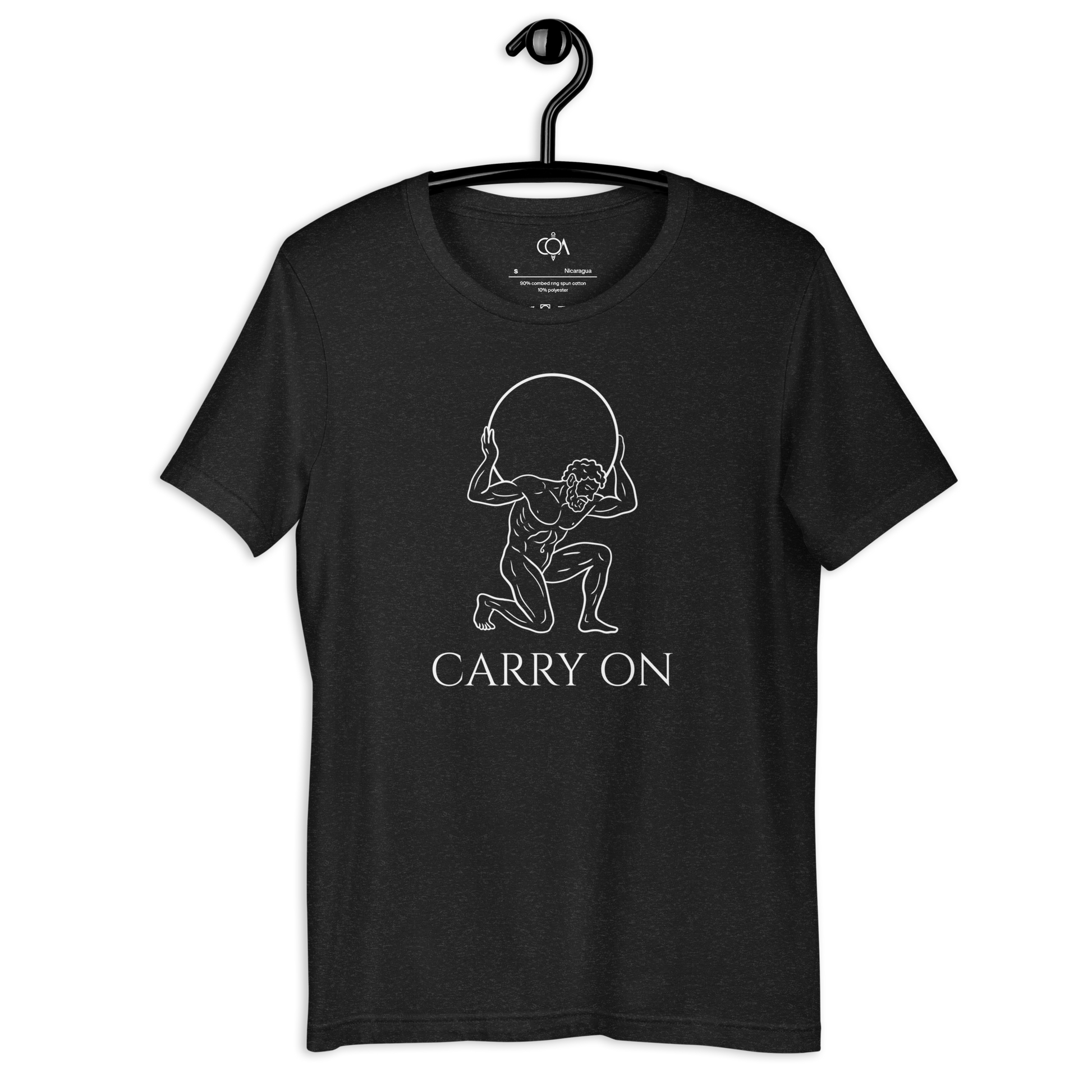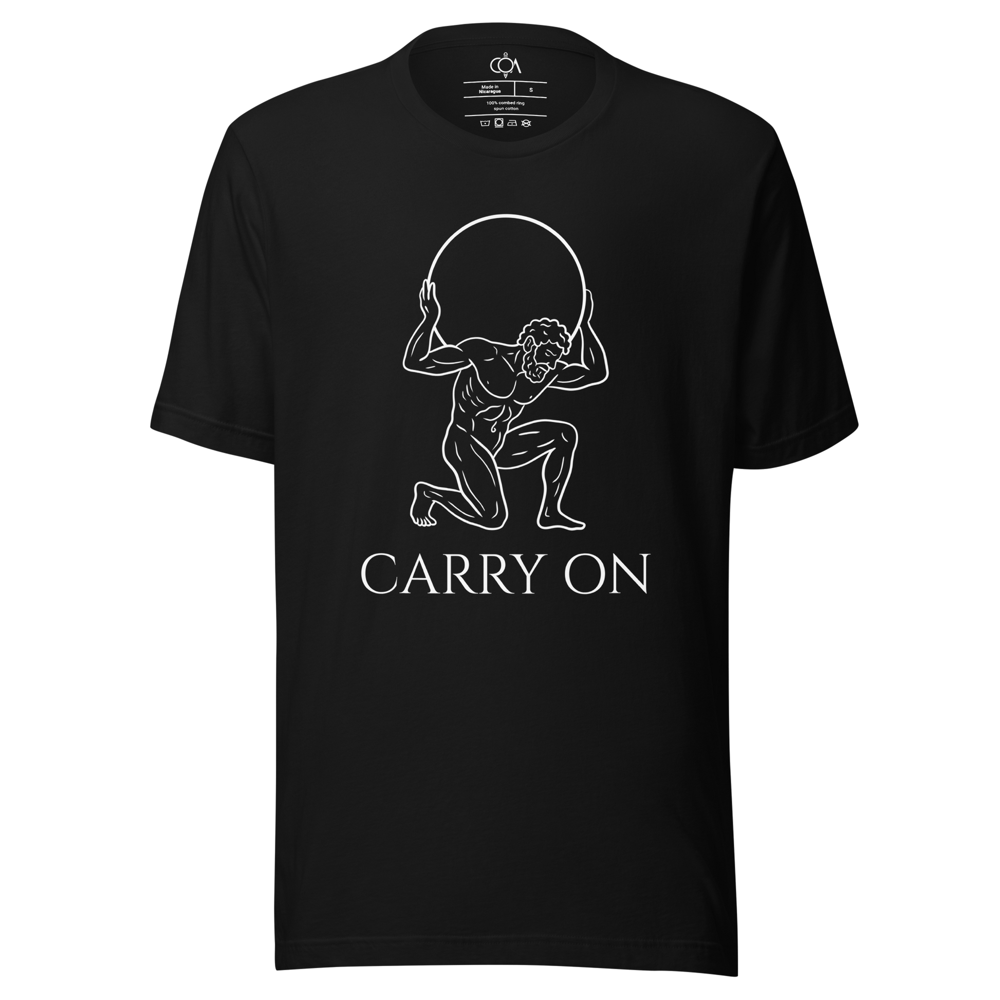 Embrace the eternal grind with this minimalist Atlas graphic t-shirt. Featuring clean line art of the mythic figure holding his boulder, paired with the phrase “Carry on ,” this shirt is both modern and timeless.